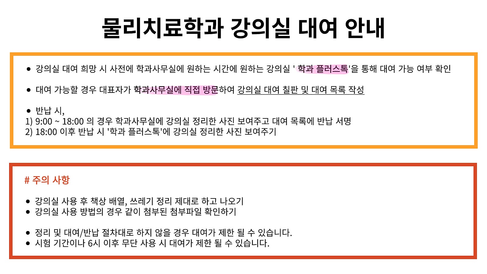3. 가능할 경우 학과사무실 방문하여 *강의실 대여 칠판 & 강의실 대여 목록* 작성
